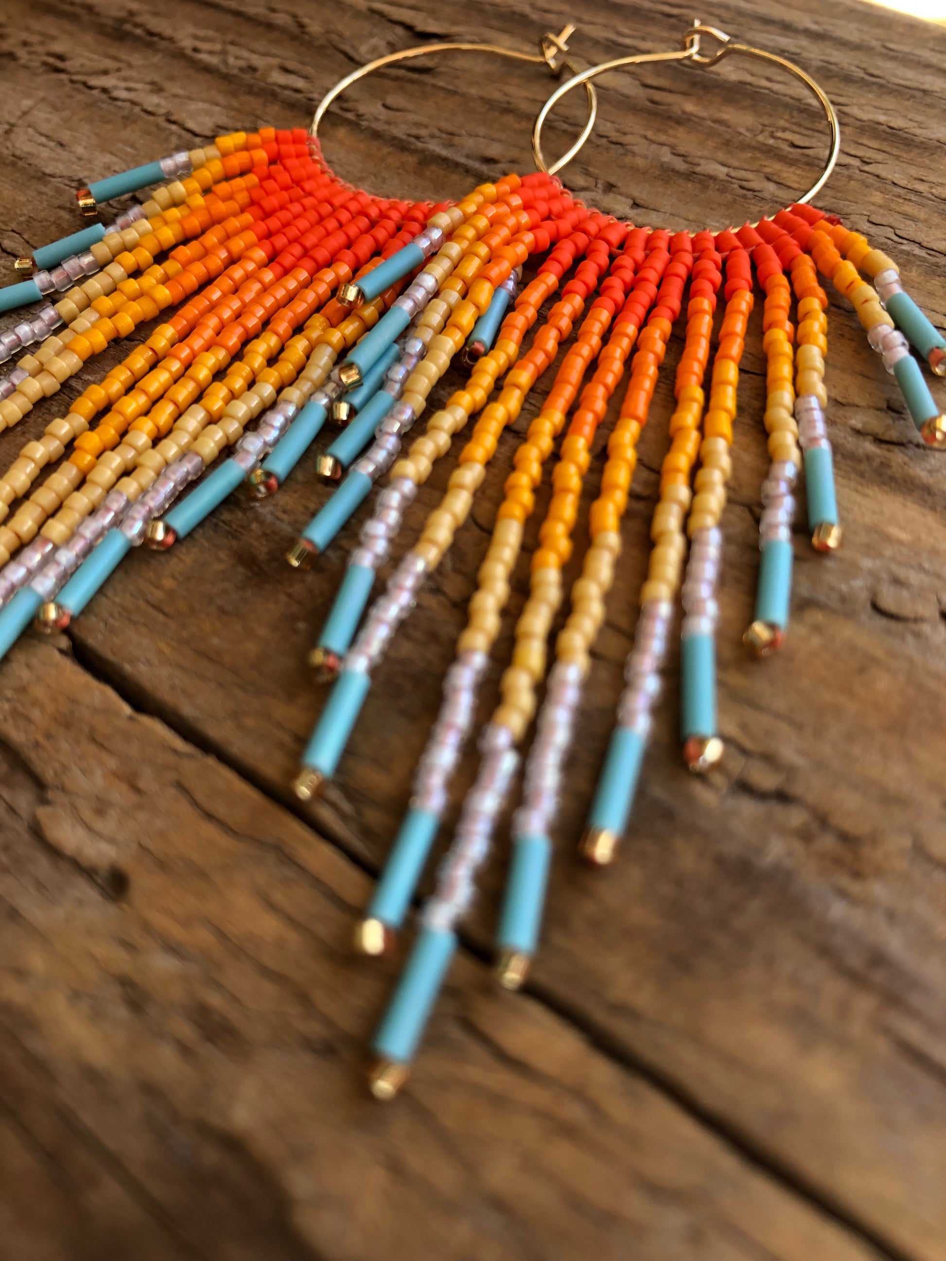 These fringe earrings are full of orange, mandarin, sun ray yellow, light topaz, sea foam, and gold Japanese seed beads. The fringe hangs delicately on a 14k gold fill hoop and fully capture the essence of a Maui sunrise.