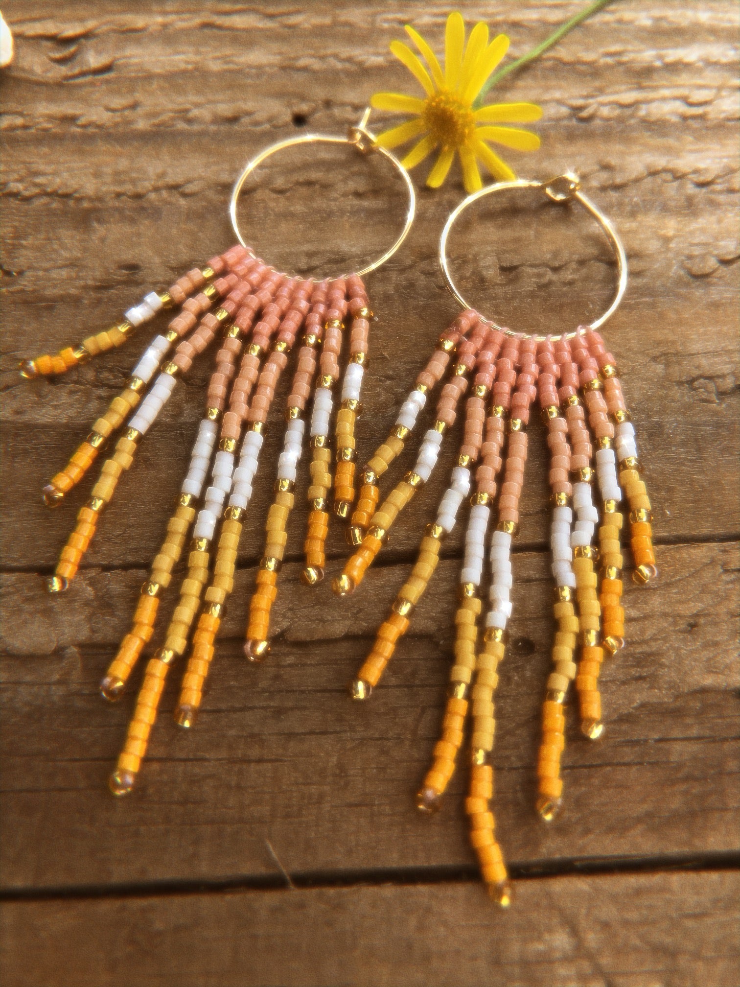 Inspired by a Maui sunrise, these fringe earrings are filled with light and dark pink, light yellow, and a golden yellow separated by a touch of sparkly gold Japanese glass beads. These are available in all sizes of 14k gold fill hoops. The ones pictured are size small.