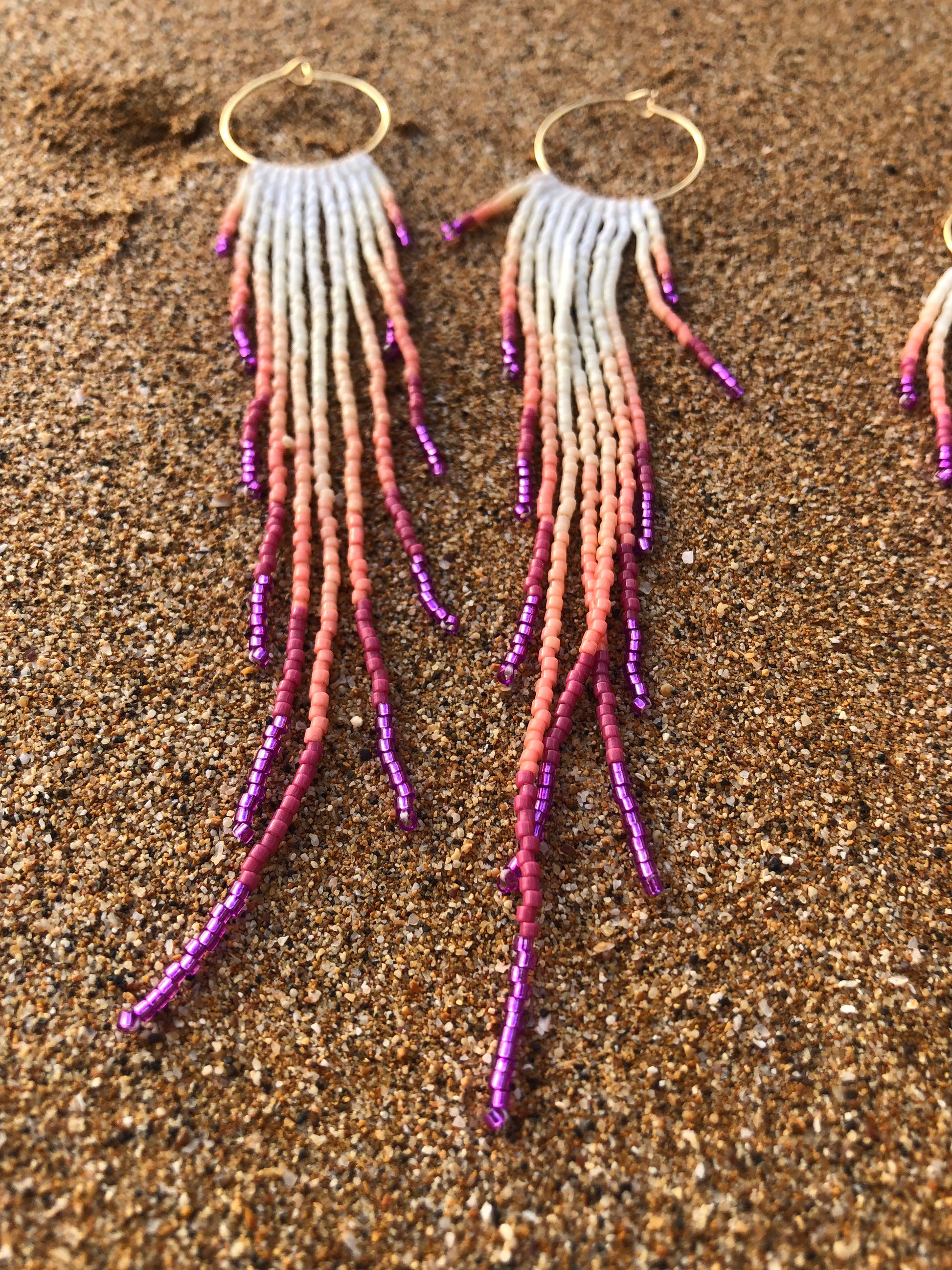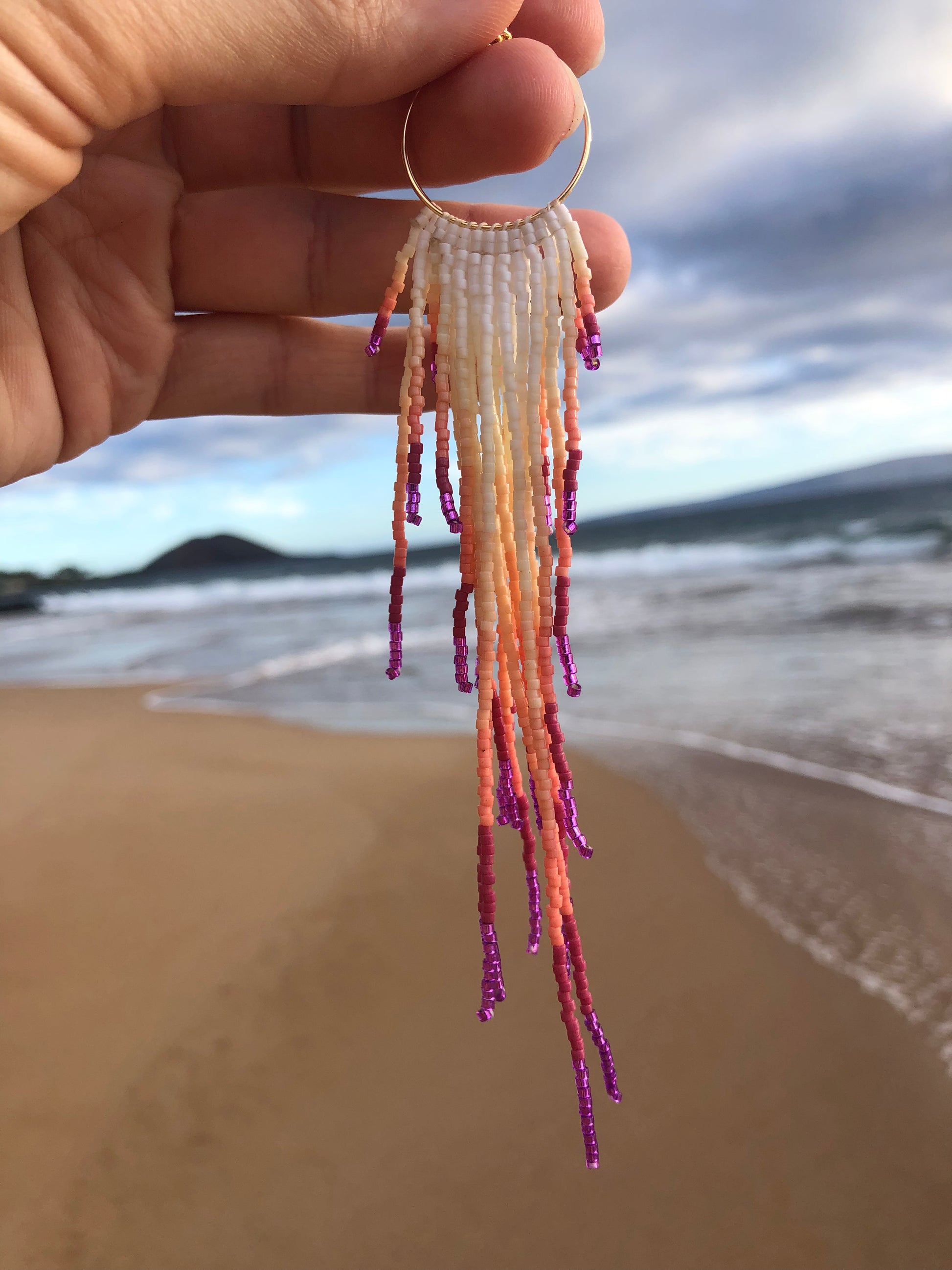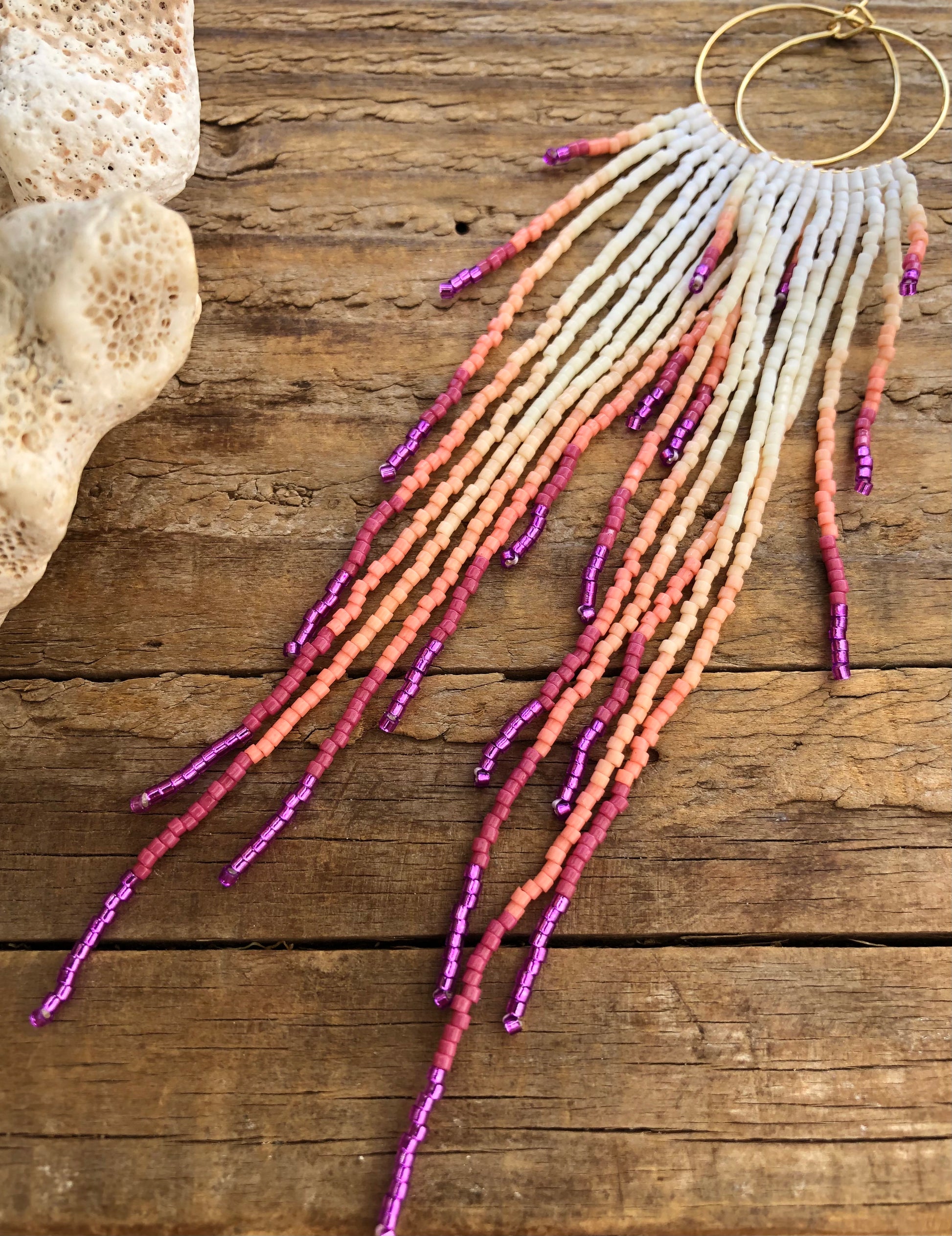 White Hibiscus inspired fringe, perfect for the summer! The fringe is made of Japanese glass beads that is hand threaded to create an ombré of pinks inspired by the beautiful white and pink hibiscus flower.